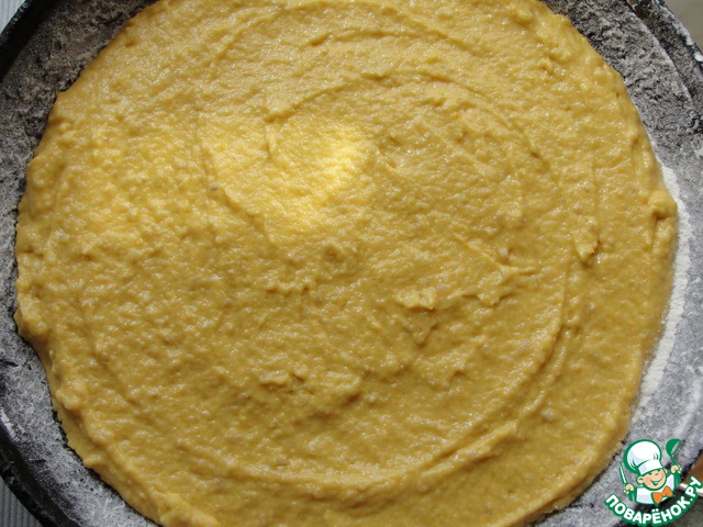 В миску с мукой (1,5 стак.) насыпаем 1 ч. л. соды по всей поверхности и перемешиваем с содержимым блендера, добавляем розовое масло, мешаем. Выкладываем тесто в форму для выпекания диаметром 28 см, смазанную растительным маслом и присыпанную мукой, и ставим в духовку, разогретую до 200 градусов на 15 минут.