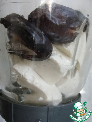 Готовим крем. Режем тофу, погружаем в блендер, туда же добавляем финики и мед, наливаем треть стакана воды (чтобы блендер завелся) и взбиваем до консистенции пасты.