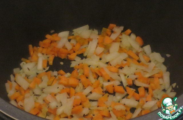 В чашу мильтиварки налить подсолнечное масло. Положить специи (кумин, калинджи, кориандр), измельчёный корень имбиря.