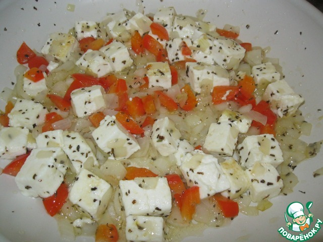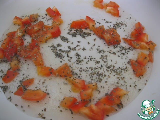 Разогреть масло на сковороде, бросить базилик и четверть болгарского перца (нарезать кубиками). Слегка обжарить, добавить измельченный лук.