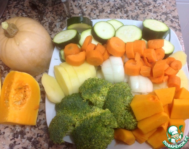В одной кастрюле сварим: кабачок, брокколи, 2 морковки, 1 луковица, 1 картофель с одним стаканом воды. Закинуть овощи в кипящую воду и варить не более 15 минут.