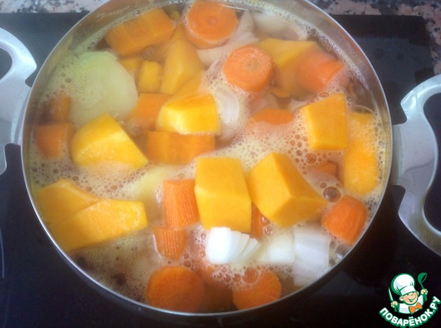 В другой кастрюле варим: тыкву,2 морковки, 1 картофель и 1 луковицу.