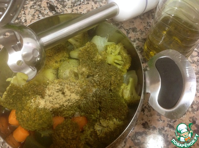 Когда овощи сварились до готовности, к зеленым овощам добавим 1ч. ложку сухого имбиря, соль и перец по-вкусу. 1ст. ложку оливкового масла и перетрем блендером в однородный крем