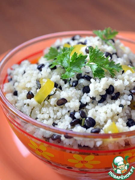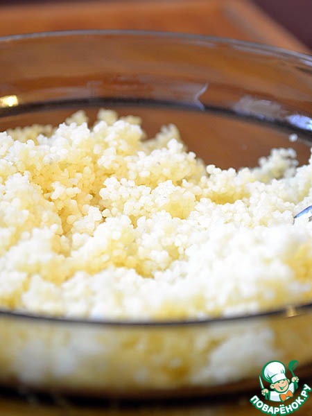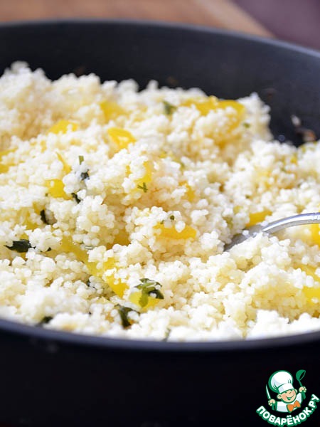 Тем временем кус-кус, впитавший жидкость, открываем и разрыхляем вилкой.