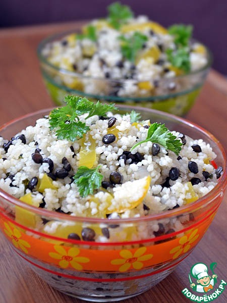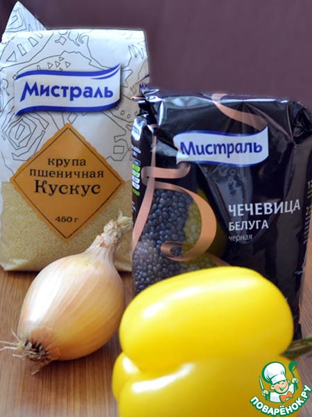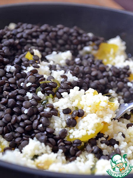 Чечевицу промываем и готовим согласно инструкции на упаковке. Кус-кус заливаем кипящим бульоном или водой, закрываем крышкой, чтобы он впитал всю жидкость.