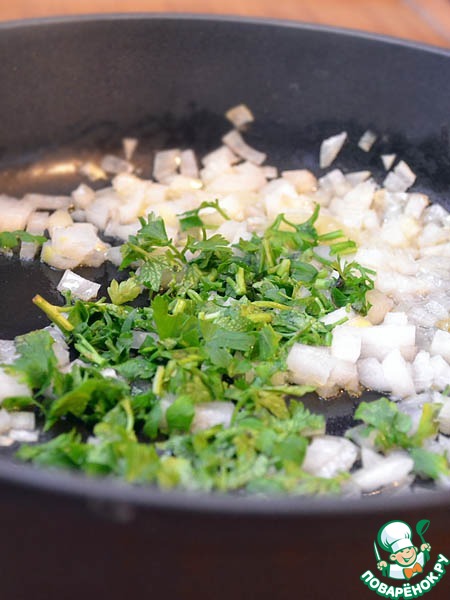 В сковороде разогреваем масло. Слегка обжариваем мелко нарезанные лук и петрушку.