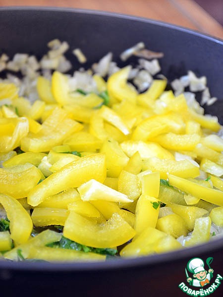 Добавляем в сковороду перец, нарезанный небольшими полосками, около 50 мл бульона, приправляем солью и молотым черным перцем, закрываем крышкой.