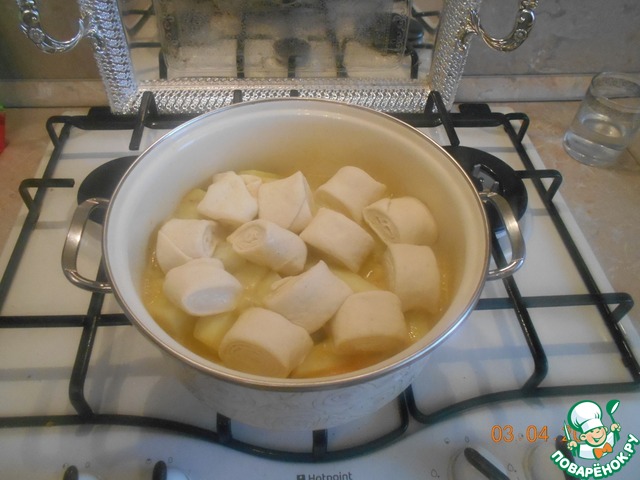 Когда закипела вода, сложим наши маленькие рулетики над картофелем и закроем крышкой. Пока не проварятся.