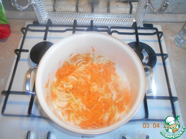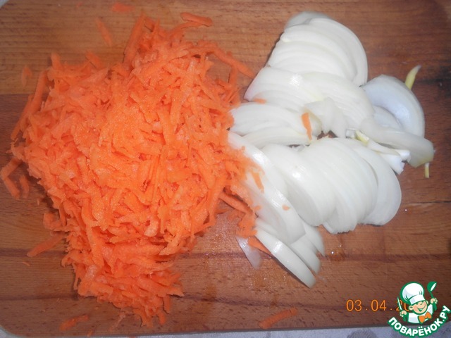 Очистим лук и морковь. Лук нарежем полукольцами, морковь натерем на терке.