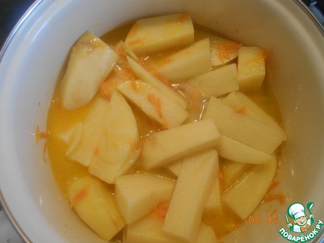 Очистим картофель, режем на большие куски и отправляем тоже в кастрюлю и заливаем водой. Солим и перчим.