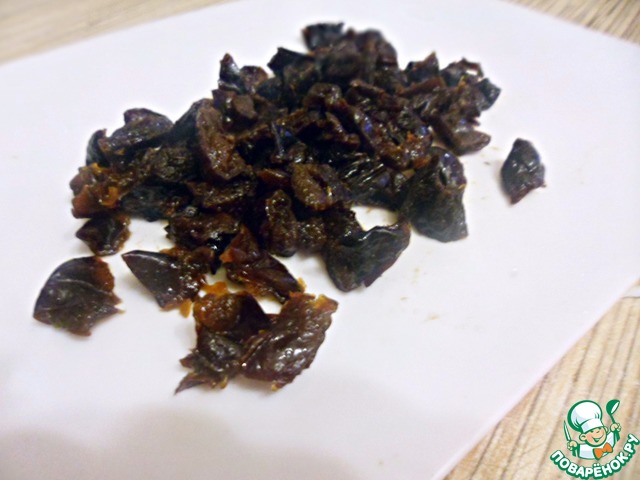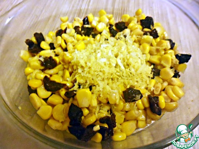 С кукурузы сливаем воду, в чашке смешиваем чернослив, кукурузу и цедру примерно с половины лимона.