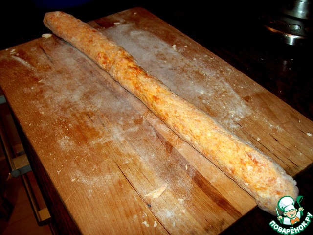 Раскатываем из полученного теста колбаску, и нарезаем на кусочки.