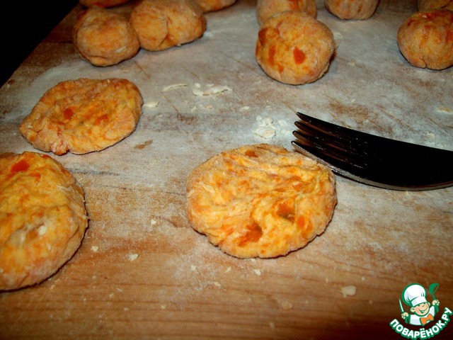 С помощью вилки раслющиваем шакрики в лепешечки.