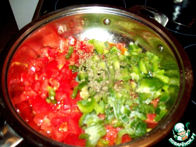 Соус. Помидоры и перец мелко нарезаем. выкладываем на сковороду с растительным маслом, солим, перчим, добавляем орегано, перемешиваем и тушим минут пятнадцать.
