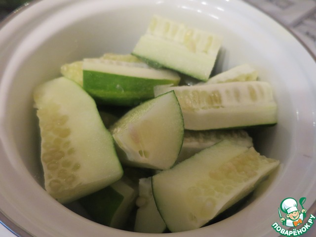 Огурцы помыть, нарезать на четыре части. Сложить в миску, посолить, оставить на 15 минут (чтобы выделился сок).