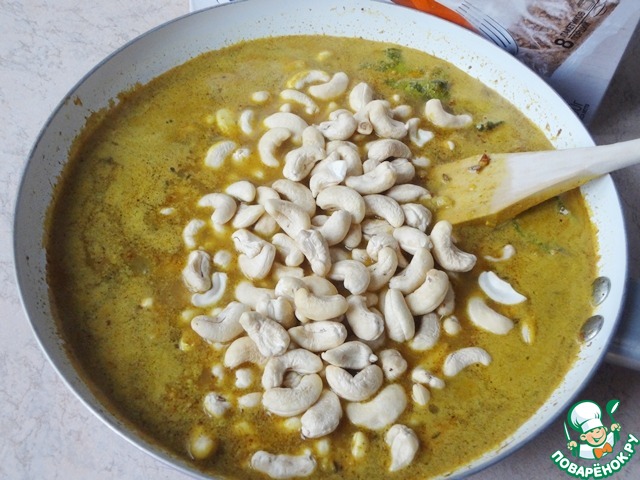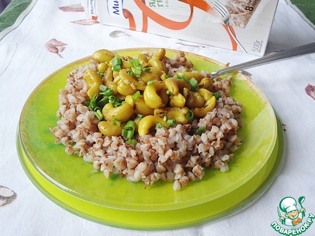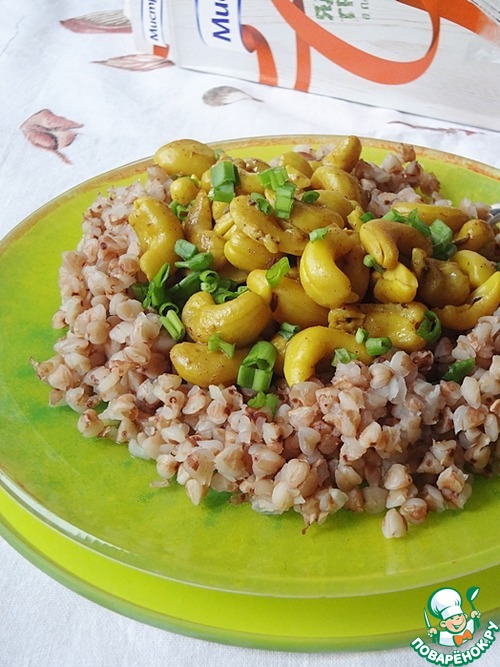 Основных ингредиентов этого блюда два: орешки кешью и гречневая крупа. Достаточно большой набор специй и приправ обеспечивает пряность блюда и может быть видоизменен по вкусу. Также овощной бульон можно заменить водой, а кокосовые сливки -кокосовым молоком, только в таком случае бульона нужно взять меньше. Для непостного варианта блюда можно использовать мясной бульон и любые сливки. Нелишне будет заметить, что в качестве крупяной составляющей я использую гречневую крупу в варочных пакетиках от ТМ Мистраль. Эта крупа варится 20 минут.