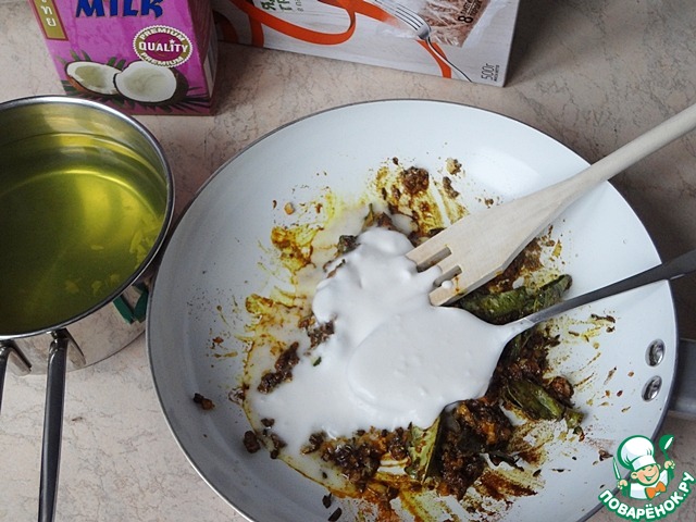 Добавьте кокосовые сливки и овощной бульон. Я варила овощной бульон со стеблями сельдерея и капустой (что было в наличии).