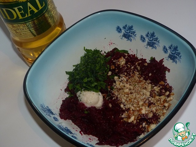 Измельчить зелень и грецкие орехи. И добавить зелень с орехами в свеклу. Добавить хрен, по вкусу соль и сахар. Все перемешать и заправить растительным маслом (я использовала подсолнечное рафинированное "IDEAL")