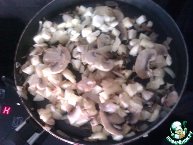 1. Обжарим слегка на оливковом масле (или любом другом) чеснок, лучок - пару минут до приятного аромата, добавим порезанные на пластинки шампиньончики. Я решила, что не хочу сильно зажаривать и добавила немного вина (застоялось в холодильнике), протушила на среднем огне.