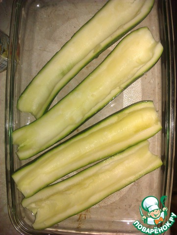 3. Берём цукини и аккуратно достаем внутренности, я это делала ложечкой не торопясь и аккуратно. Выложим в форму, в которой будем запекать. Внутренности порежем и добавим на сковородку - пусть и они протушатся в компании с лучком и грибами.