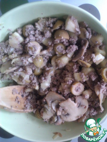 Смешаем микс со сковородки, с блендера и добавим порезанные на кружочки оливки, 1/3 потертого сыра. Анчоусов не нашла из рецепта по-лигурийски, думаю они придадут свою пикантность. Но насколько я знаю, анчоусы очень соленые, мне мой вариант микса (тунец+каперсы) и так показался достаточно соленым, поэтому даже не знаю стоит ли просто с анчоусами рисковать..