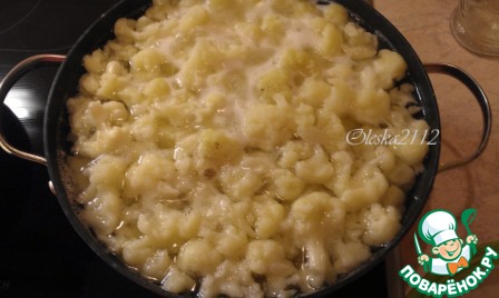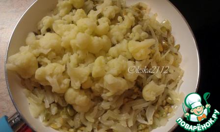 Выкладываем в сковороду отваренную цветную капусту и тщательно перемешиваем. Снимаем с огня и раскладываем по тарелочкам.