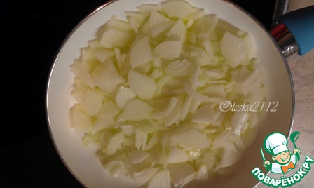 Лук очищаем и режем по своему вкусу. Мне нравится крупно. Обжариваем его до мягкости на сковороде в сливочном масле.