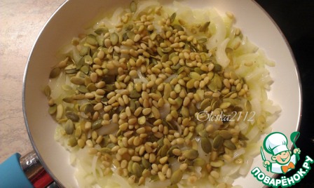 Теперь добавляем тыквенные семечки и орешки, обжариваем ещё пару минут.