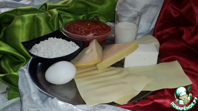 Выложить последний слой листов лазаньи,3-5ложек помидоров, последнюю треть мягкого сыра с яйцами, вторую половину рикотты. Смешать сливки и яйцо и залить этим лазанью.