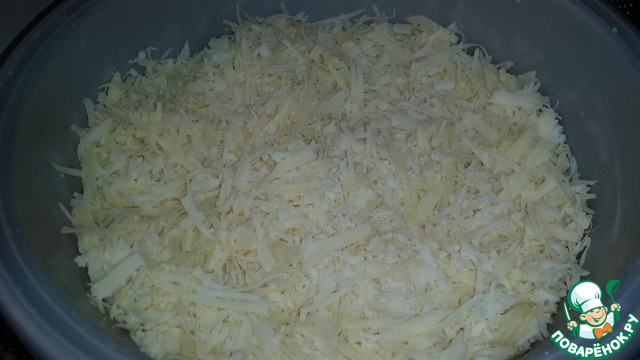 500 г твёрдых сыров (пармезан+голандский) натереть и смешать