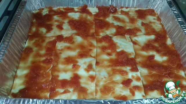 В форму для выпекания выложить и размазать 3-5с. ложек (но можно и чуть больше) измельчонных помидоров. На них выложить слой листов лазаньи (предварительно замоченных), так что-бы листы покрыли всю форму.