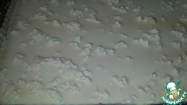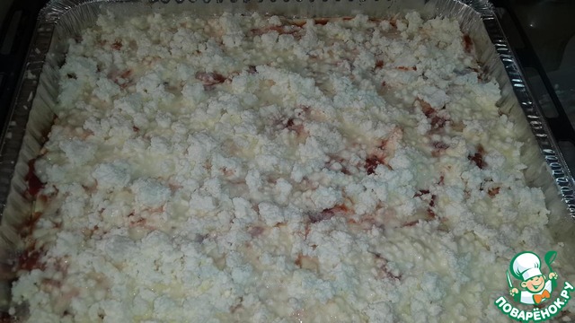 Выложить следующий слой листов лазаньи,3-5с. ложек помидоров, вторую треть мягкого сыра с яйцами, и половину рикотты.