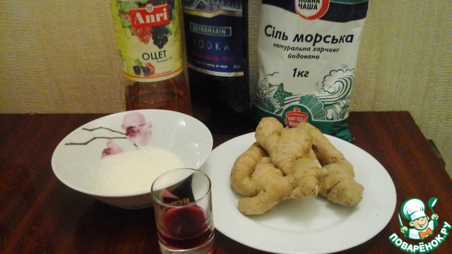Ингредиенты.. Важно, чтобы Вы выбрали молодой имбирь, - тогда он будет мягче и нежнее. Для этого ковырните кожицу понравившегося Вам корня имбиря, она должна отойти как у молодого картофеля.