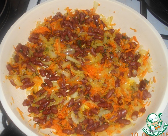 Лук нарежьте полукольцами, морковь натрите на терке и обжарьте оба на сковороде в растительном масле. Туда же отправьте фасоль я использую