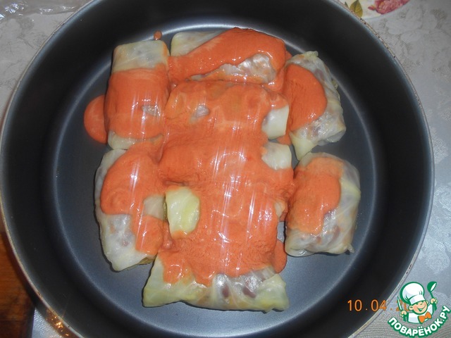 Залейте томатной пастой смешанной с мукой и водой. Прикройте фальгой и поставьте в духовку на 20 минут разогретую до 180 градусов.