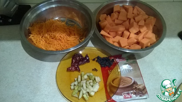 Тыкву, морковь почистить, вымыть. Тыкву нарезать кубиками, морковь натереть на средней терке или натереть с помощью кухонного комбайна. Грушу нарезать небольшими кубиками.