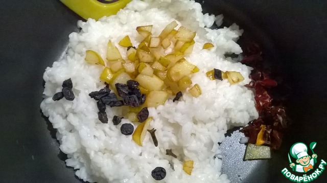 Переложить в кастрюлю достаточной емкости полуготовый рис. Добавить к нему, не сливая масла, кусочки обжаренной груши. Положить кусочки сушеного сладкого перца, кизил, 2 бутончика гвоздики.