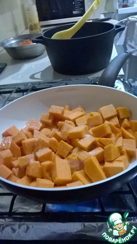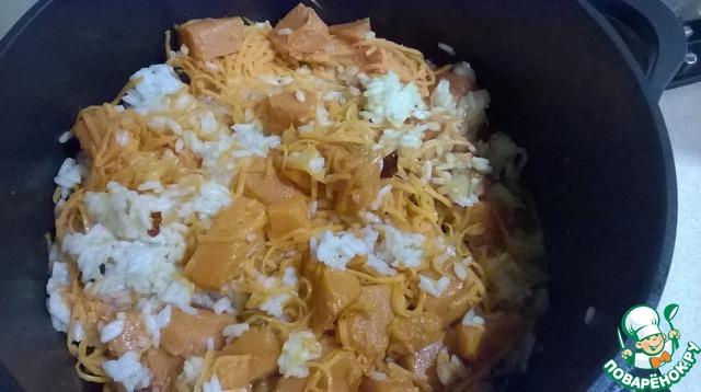В масло, оставшееся от жарки груш, положить кусочки тыквы и тушить их до полуготовности. Добавить во время тушения в тыкву сахар. Когда тыква дойдет до нужной степени готовности - переложите ее в кастрюлю к рису. Масло не сливайте.