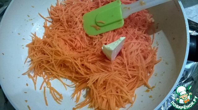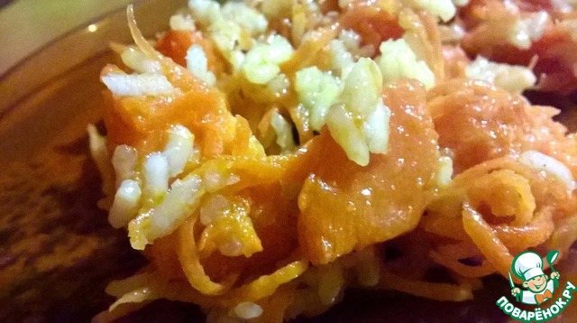 В оставшееся от жарки груши и тыквы масло положите тертую морковь. Если Вы используете свежий сладкий перец - самое время добавить его на сковородку). Подсолнечного масла к этому моменту на сковороде будет немного. Поэтому самое время добавить сливочное масло. небольшой брусочек. И снова отправляем все в кастрюлю с рисом и тыквой.