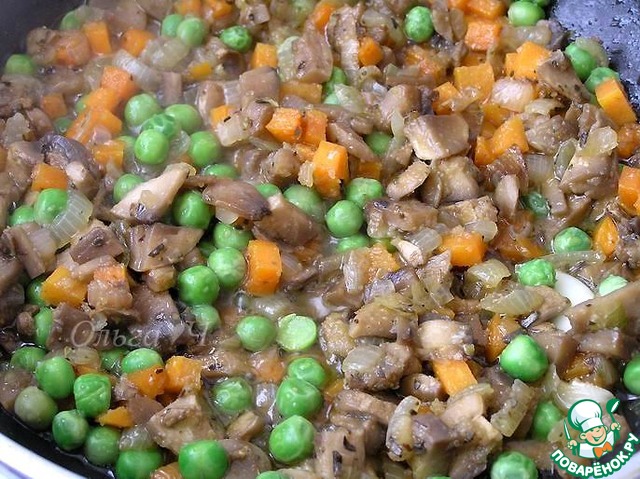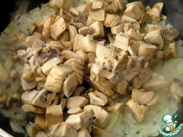 На растительном масле обжарить нарезанный лук и раздавленные зубчики чеснока, присолить. Добавить грибы, готовить пока не испарится лишняя жидкость.