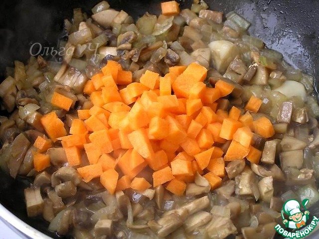 Добавить морковь, нарезанную кубиками, готовить, помешивая, еще минут 5.
