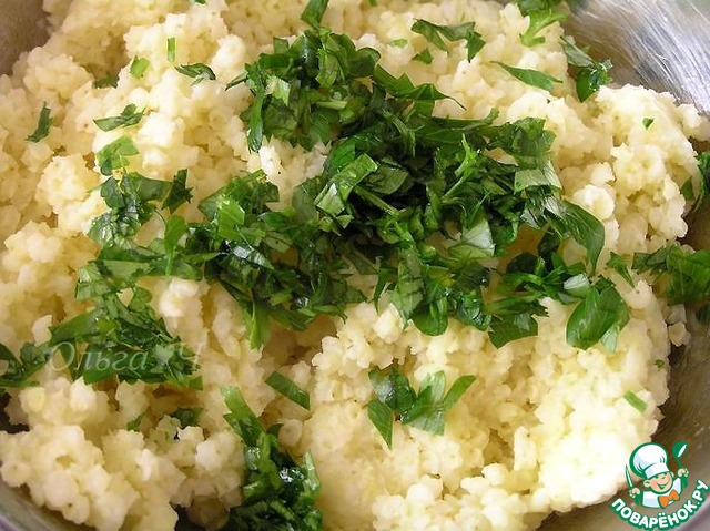 Пакетики с готовым пшеном откинуть на дуршлаг, дать стечь воде. Пшено аккуратно освободить из пакетиков, выложив в удобную емкость, присолить, добавить петрушку, перемешать.