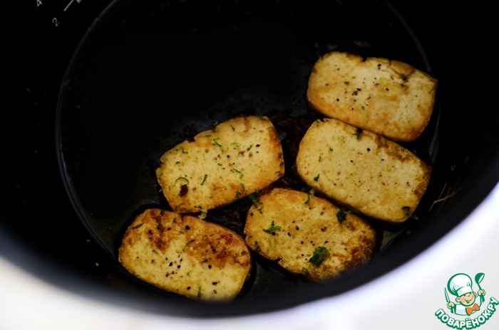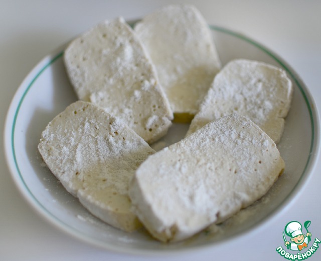 Нарежьте его ломтиками толщиной 1 см. Промакните бумажным полотенцем, чтобы избавиться от лишней жидкости.