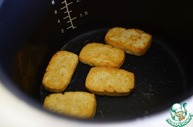 Включите в мультиварке режим Поджаривание, разогрейте кунжутное (или оливковое) масло. Обжарьте тофу до образования румяной корочки и выньте из чаши специальной лопаточкой.