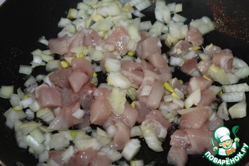 Лук очистить, мелко нарезать, обжарить на растительном масле вместе с курицей (или в одиночестве).