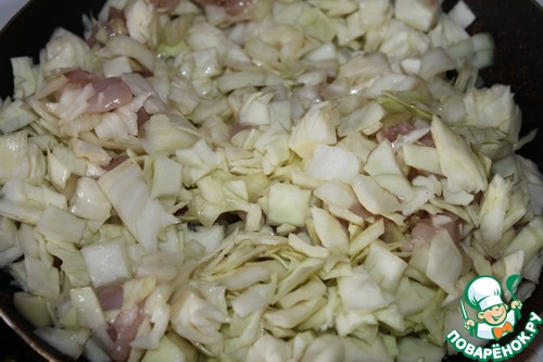Нашинковать белокочанную капусту. Добавить на сковороду, перемешать.