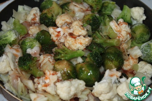Добавить брюссельскую капусту (опять же замороженная, можно и свежую, конечно), перемешать.