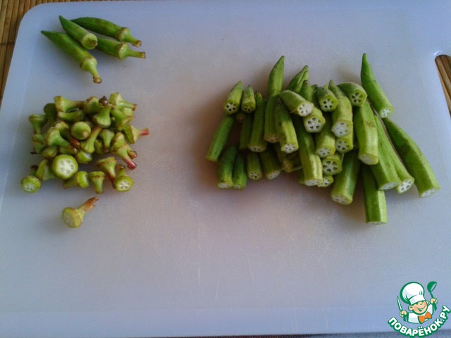 В сковороду налить растительное масло, слегка обжарить бамию. Это необходимо для того, чтобы из бамии вышла излишняя слизь. В процессе обжаривания увидите слизистые тянущиеся нити. Бамия не должна прижариваться, помешивайте. Если излишки масла остались после обжаривания, уберите их.