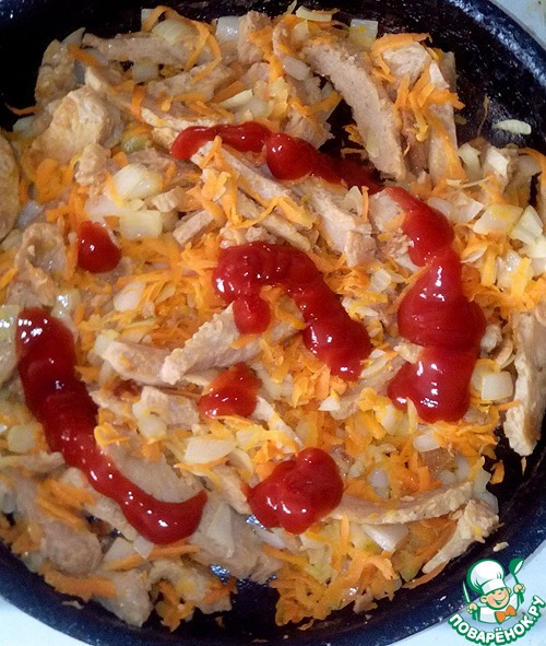 Добавляем кетчуп или томатную пасту. Перемешиваем.
