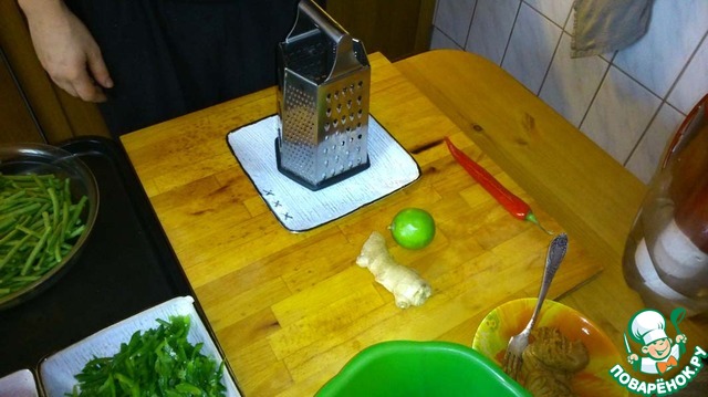 Беремся за терку. В работе с тёркой будут участвовать: лайм и корень имбиря. А именно. Натираем цедру с лайма, а корень имбиря просто натираем на мелкой терке.